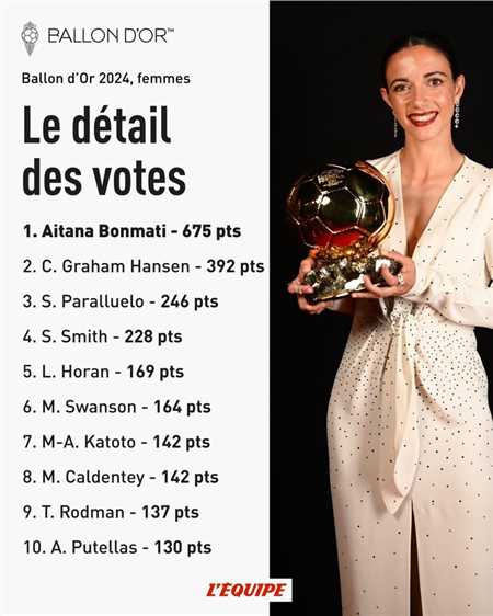 金球奖官方公布了2024女足金球前十名的投票得分情况,蝉联女足金球的巴萨女足中场邦马蒂以675分断层领先,第二名汉森为392分、第三名帕拉略洛为246分。