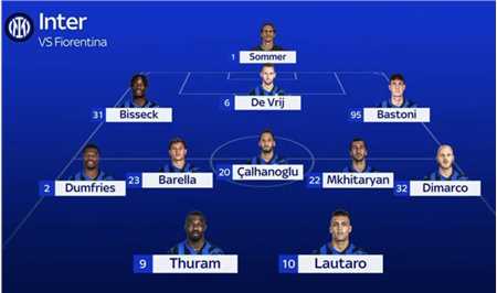 索默;比塞克、德弗赖、巴斯托尼;邓弗里斯、巴雷拉、恰尔汗奥卢、姆希塔良、迪马尔科;马库斯-图拉姆、劳塔罗