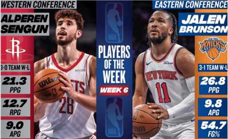 早些时候,nba官方揭晓了本赛季第六周的周最佳球员,阿尔佩伦-申京和杰伦-布伦森分别当选。