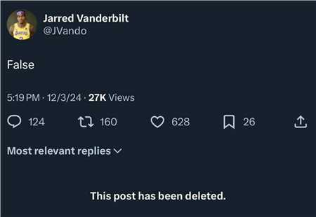 湖人真正目前有两名长期伤员:范德比尔特和伍德。据nba名记shams报道,范德比尔特的伤情出现反复,他的左膝出现了积液,预计2025年1月才能复出。范德彪本人更推回应:“错误的报道!”但是没过多久,范德彪又删除了。
