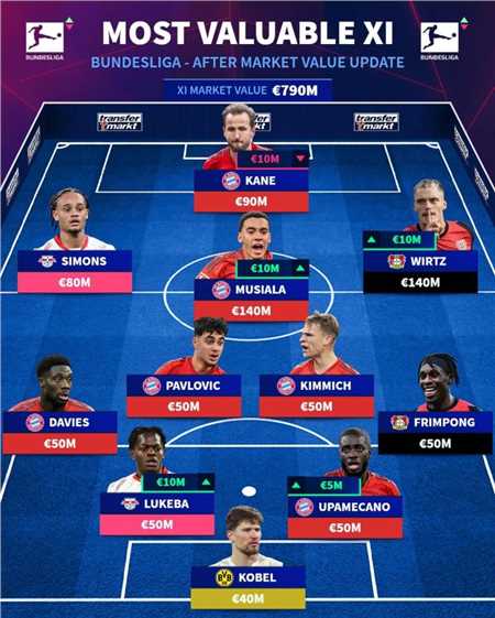 前场 : 穆西亚拉(拜仁,1.4亿欧,+1000万欧)、凯恩(拜仁,9000万欧,-1000万欧)、哈维-西蒙斯(莱比锡,8000万欧)、维尔茨(勒沃库森,1.4亿欧,+1000万欧)