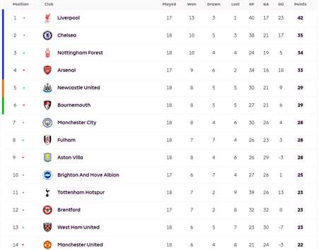 纽卡3-0战胜维拉,排名超过本轮0-0战平的伯恩茅斯,上升至第五,伯恩茅斯屈居第六。
