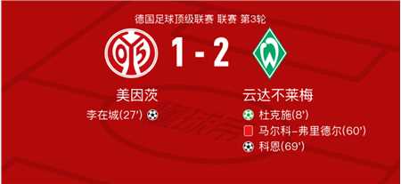 北京时间9月15日美因茨vs云达不莱梅,李在城得到全场最高的8.0分,科克-托普得到全场最低的5.6分