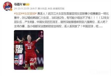 女足亚冠小组赛第3轮,武汉车谷江大女足0-2不敌韩国仁川现代制铁红天使女足。目前武汉女足排名小组第三,还有出线希望。对此,《体坛周报》记者马德兴在微博里表示:“中国女足的五冠王,主场办赛,连小组赛都没能提前锁定出线权,丢人丢到家了!”
