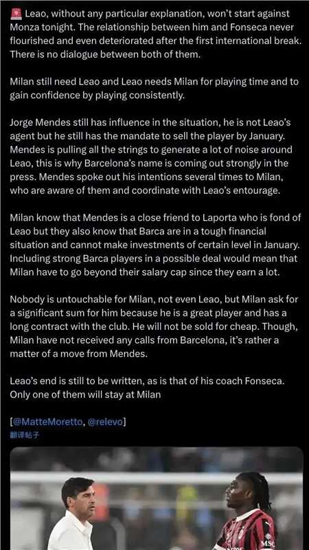 莱奥可能转会!门德斯他不是莱奥的经纪人,但他想1月之前出售这名球员。门德斯在幕后操纵,在莱奥周围制造了很多动静,这就是为什么巴塞罗那的名字被媒体大肆报道。门德斯曾多次向米兰表达了自己的意图,米兰知道这些,并与莱奥的经纪人进行协调。门德斯对莱奥在米兰的境遇十分不满,而米兰也对莱奥表现有点失望,莱奥想离开米兰不是问题,只要足够转会费莱奥可以离开。